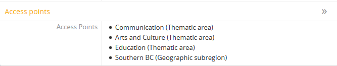 The Thematic area access point is intended to assist users in identifying major collecting areas of an archival institution by offering them a sense of the subject matter addressed in the holdings of the institution. AtoM includes a number of default terms (included in both French and English) in the Thematic area taxonomy, derived from the terms used in the Canadian Council of Archives’ Directory of Archives: