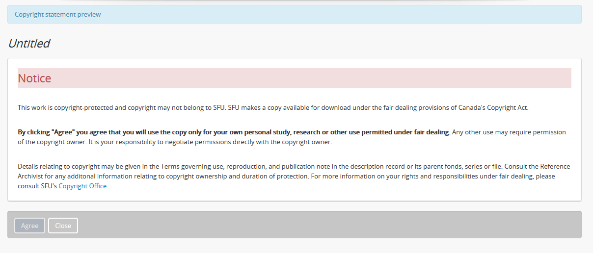 - The “Agree” button in the button block on the preview page will be disabled - normally users who click “Agree” will be taken to the related master digital object.