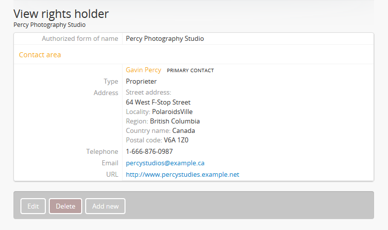 - If you click on the hyper-link name of a rights holder, AtoM takes you to the View rights holder page.