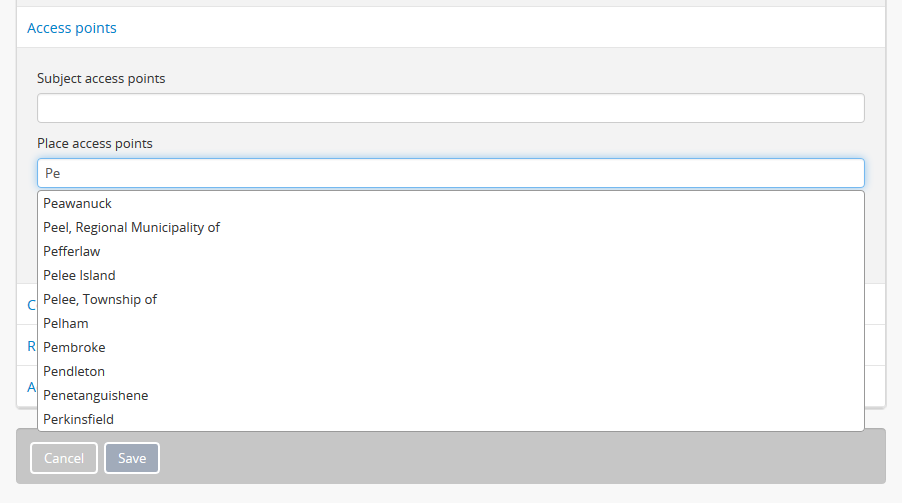 1. Navigate to the Access points information area and beginning typing your place or subject access point into the relevant field. Wait a moment and do not press enter immediately - the access point fields will auto-complete any matching terms in a drop-down menu, allowing you to see if your access point already exists.