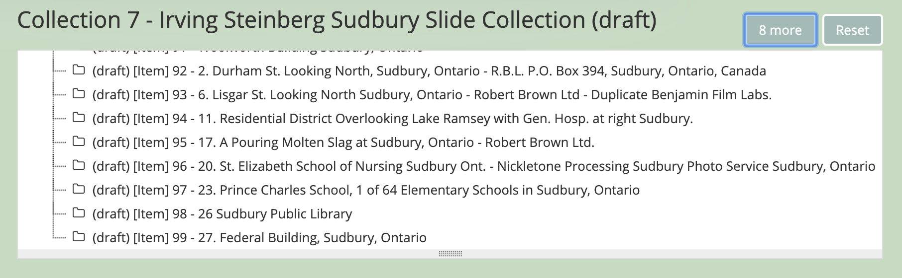 The full-width treeview, pictured above, has some notable differences from the older sidebar treeview. Most notably, it will allow users to browse all levels of description in the hierarchy of the archival unit at one, while the sidebar treeview will only display siblings of the currently viewed level. By being positioned in the center of the page, it necessarily has more room - and a user can click and drag the bottom bar of the treeview to expand the viewing area further: