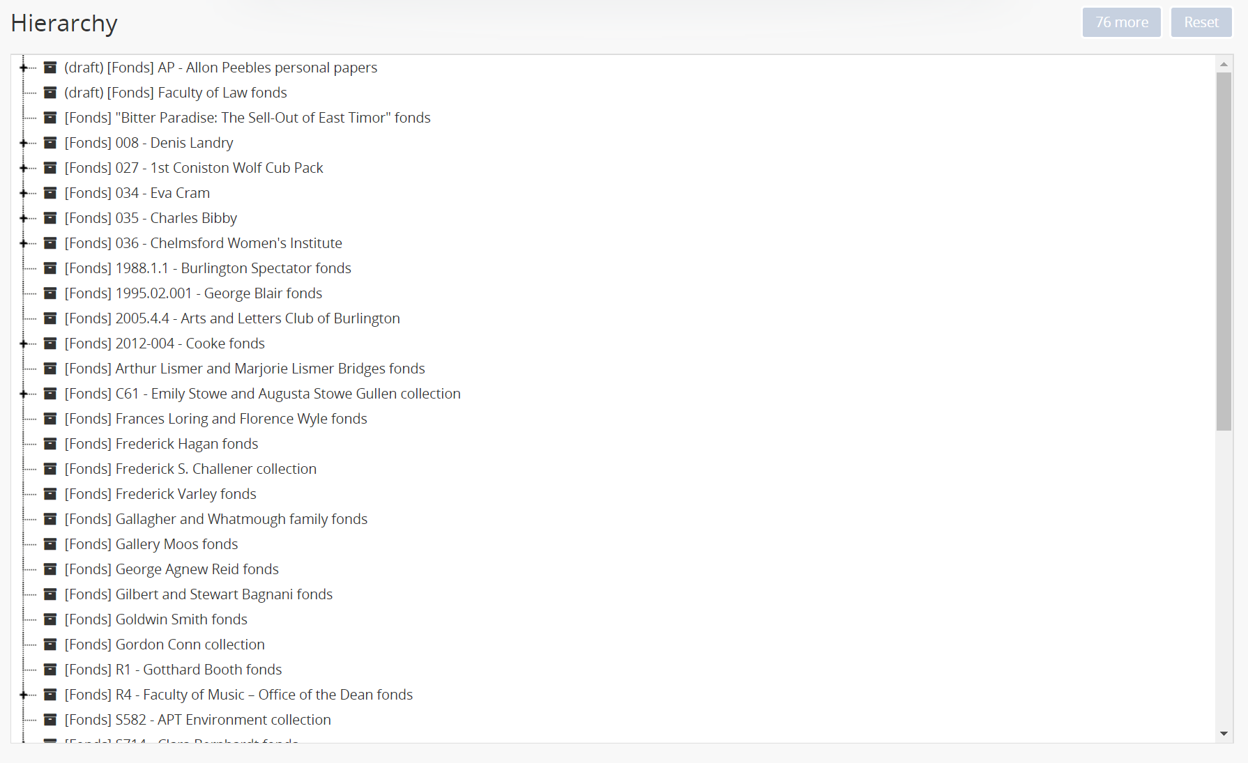 - Click on the name of the archival unit (e.g. fonds or collection) whose lower-level records (children) you would like to explore.