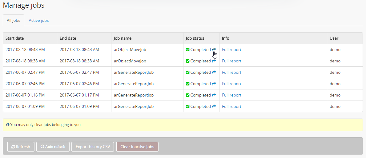 On the Jobs page, if the job has been successfully completed, then a link to the record’s new location will appear as a blue arrow in the Job status column.