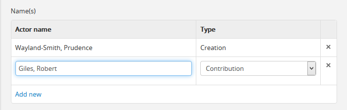 - Whenever a new name is added to a description (either as a creator, or as a name access point), a new stub authority record is automatically generated for that person, family, or corporate body, which can then be supplemented by navigating to the authority record itself. The new authority record is linked to the archival description, and the new name will now appear in the autocomplete drop-downs when a user starts typing to add any other creator names or name access points in subsequent descriptions.