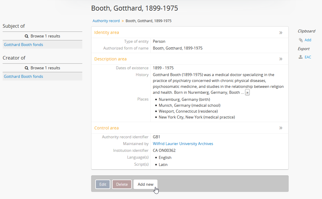 A new authority record can also be added to AtoM from the view page of any other authority record via the “Add new” button in the button block. To do so: