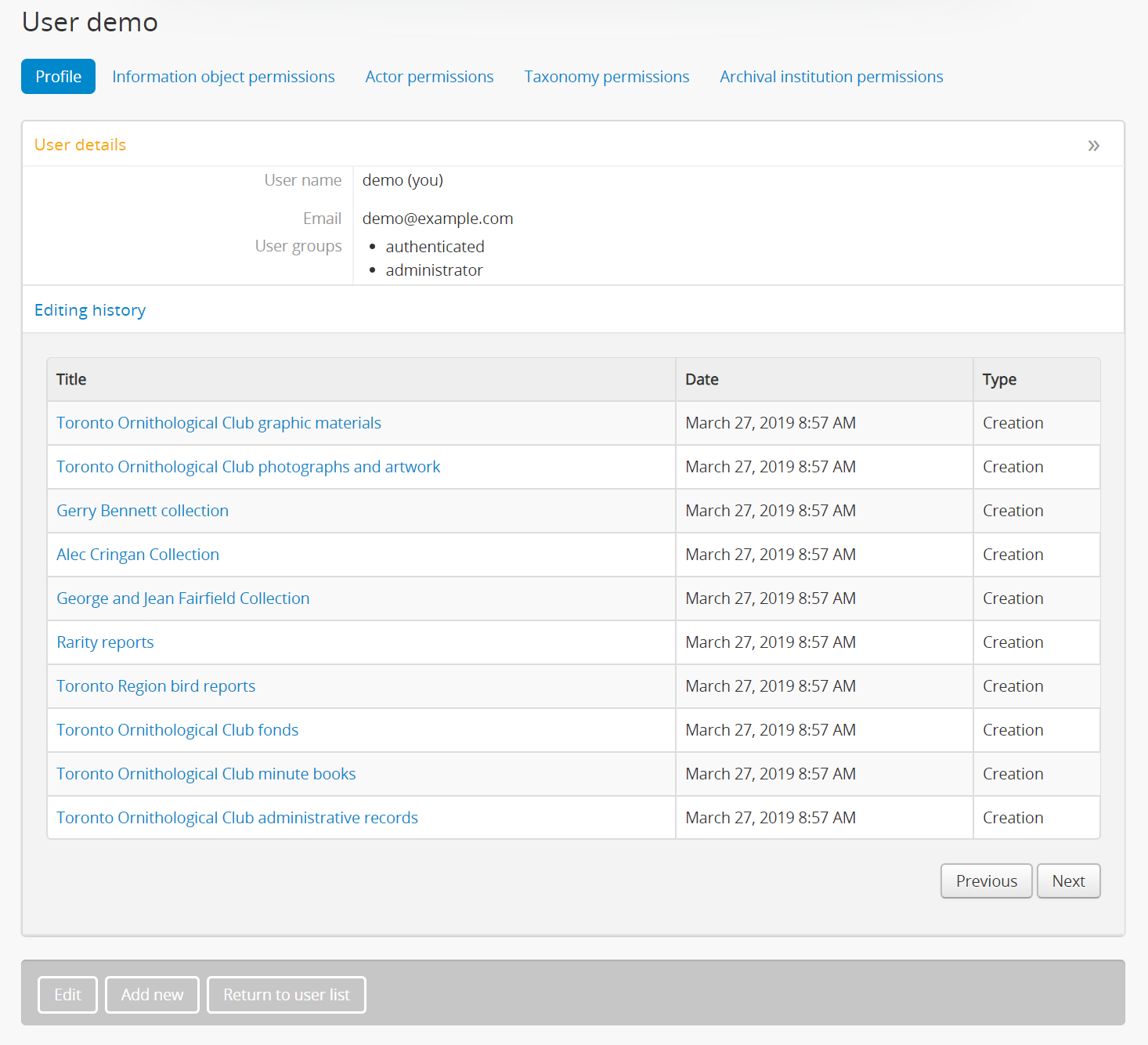 1. The number of results included in the Editing history pane is determined by the Results per page setting in Admin > Settings > Global. If there are more results than the results per page setting, AtoM will display “Previous” and “Next” buttons at the bottom of the table for navigation.