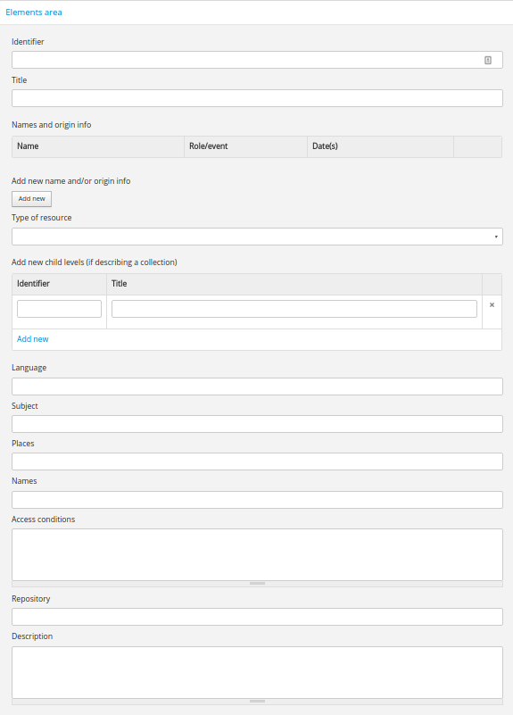 These two fields can be used to add lower levels to a collection level description. Click “Add new” to create as many child levels as necessary.