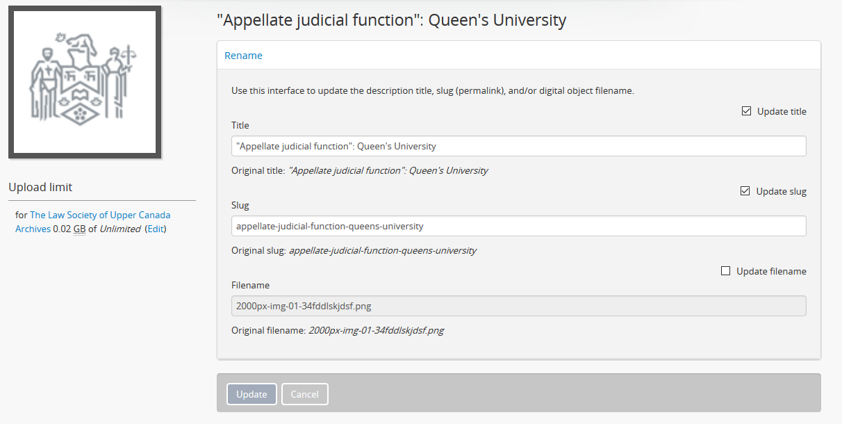 1. To the right of the edit fields, there is a checkbox corresponding to each field. By default, the title and slug checkboxes will be checked, and the filename field will be unchecked. The checkbox associated with a field must be checked to enable editing. You can uncheck these fields at any time to disable them - doing so will undo any changes made and prevent the field from updating when the “Update” button is clicked. To edit the filename of the linked digital object, check the “Update filename” box. You also might wish to uncheck the Title and Slug boxes, to prevent any accidental edits.