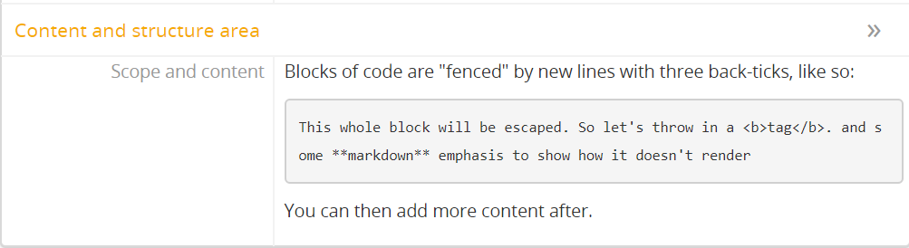 The following documentation will outline how Markdown can be used in AtoM. In each example, the syntax to be used in edit pages will be shown in an escaped block. Below that, an image of the escaped block, and how it will look when parsed and rendered on an AtoM view page, will also be shown. We encourage you to play around with it yourself to better understand the examples provided.