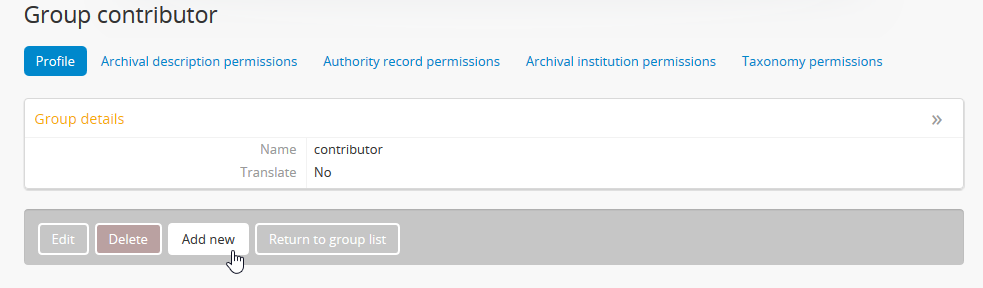 A new group can also be added to AtoM from the view page of any other user group via the Add new button in the button block. To do so: