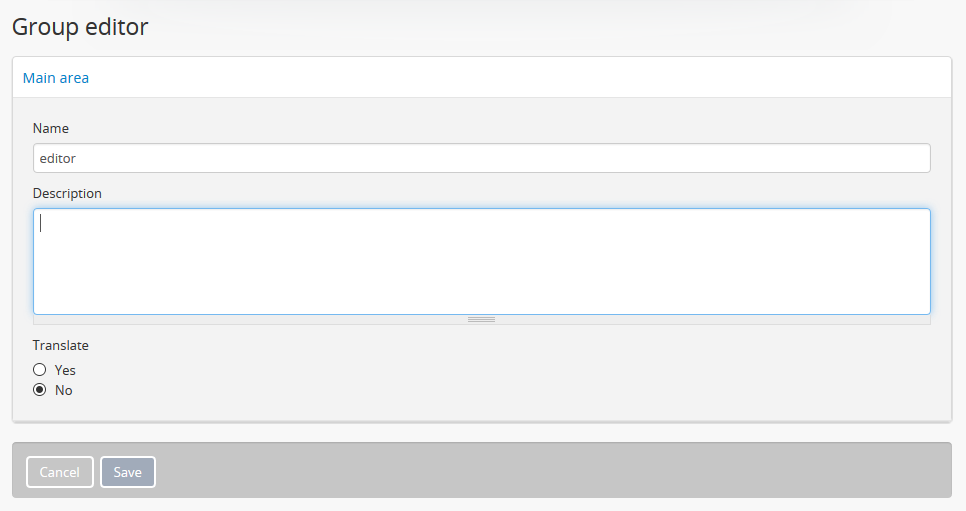 - On loading, the edit page displays the user group’s information areas; add and/or revise data as required.
