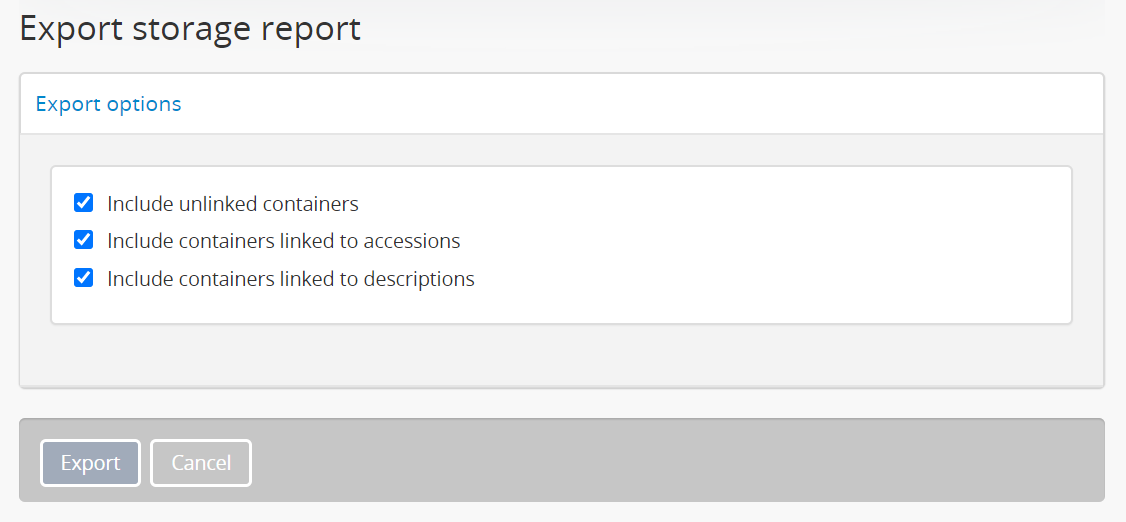 AtoM includes a global physical storage report that can be generated via the user interface from the Physical storage module and downloaded as a CSV file from the Jobs page. This report is focused on container relations (i.e. physical storage containers linked to other entity types in AtoM, such as archival description and accession records), and can also be used to identify unlinked containers. Export options on the report generation page allow users to choose which of these criteria should be included when creating the report: