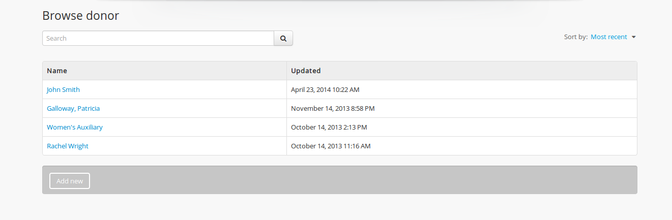AtoM will display a list of all donors by name as well as when the donor record was updated.