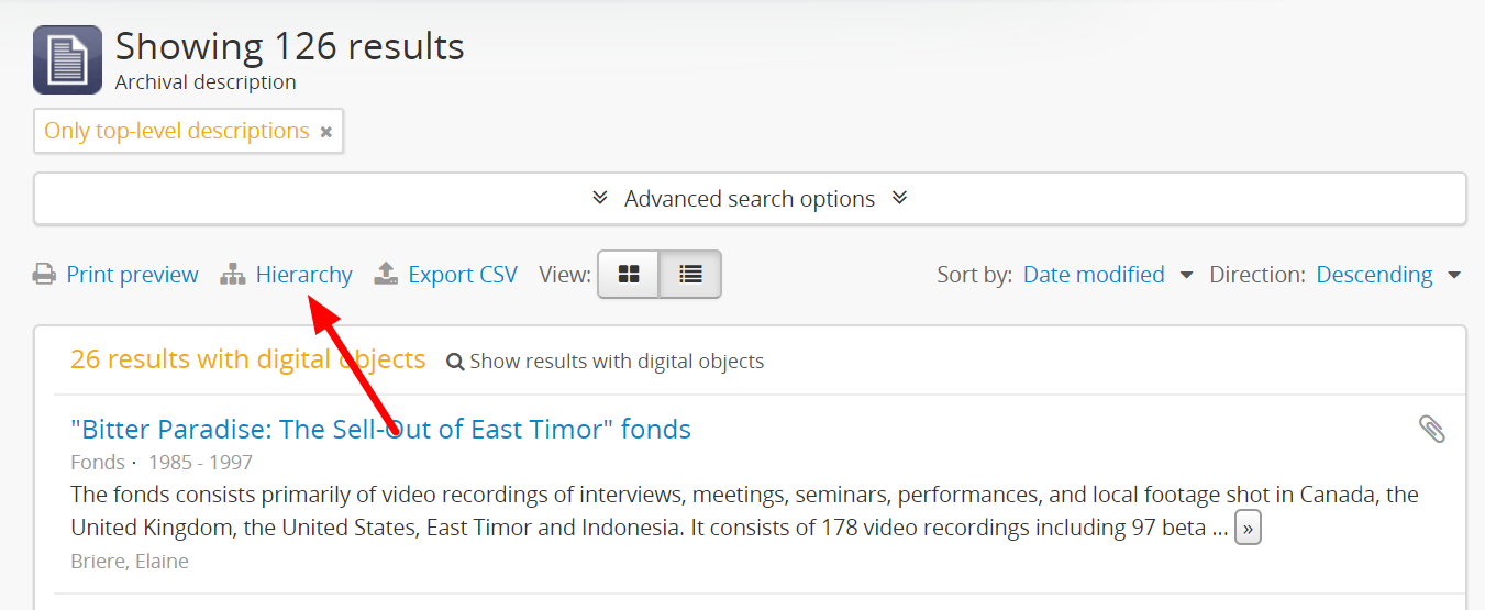 When arriving on the archival description browse page, a top-level description filter is engaged by default, meaning that all results shown are parents with or without children, but without any higher levels of description above them in the hierarchy. Users can disengage this filter by clicking the X on the “Only top-level descriptions” filter tag at the top of the results (see Using the top-level description filter).