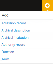 The Add menu’s options will redirect users to blank records in edit mode, ready for data entry. Using the Add menu, users can quickly create new accession records, archival descriptions, archival institutions, authority records, functions, and terms.