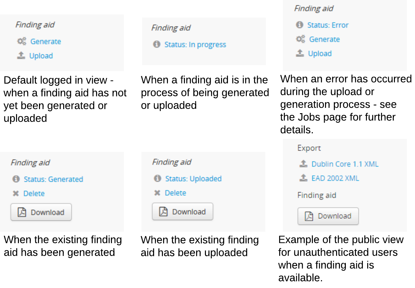 • In progress: The job is underway and the finding aid is generating or being uploaded. Refresh the page for an updated status, and/or visit the Jobs page - see: Manage jobs